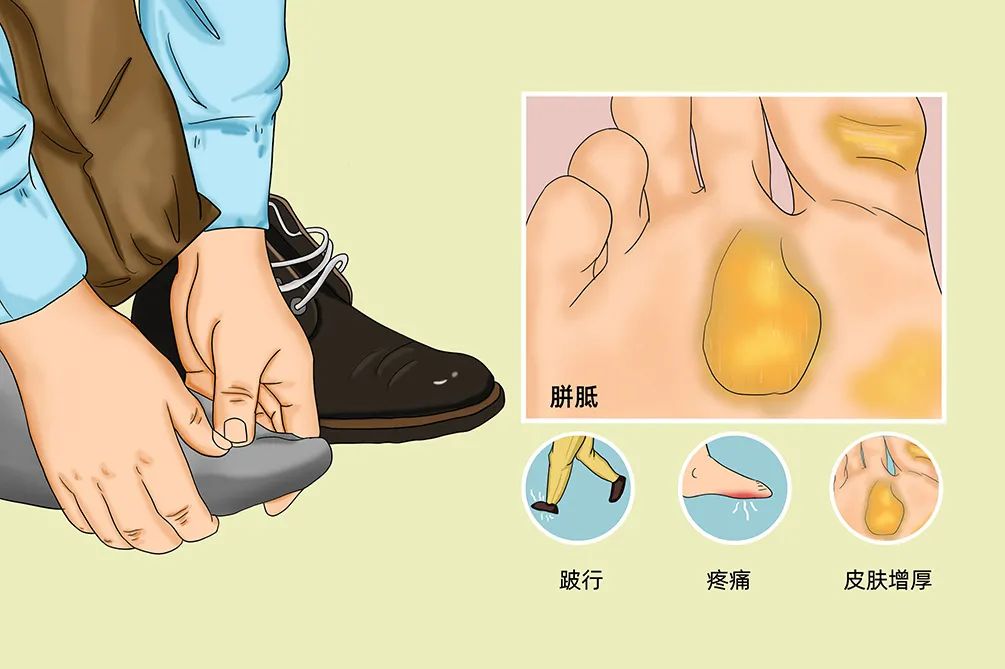 好发于足部畸形患者、体力劳动者,是由于局部皮肤长期受压迫和摩擦导致的黄色或蜡黄色增厚的角质性斑块,可出现局部汗液分泌减少、感觉迟钝的症状,严重者可疼痛,甚至造成足溃疡。